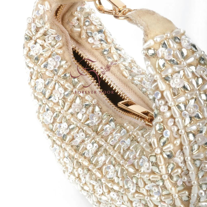 Featuring a beige handcrafted handbag with in suede base with cutdana work. It has a suede lining. It is ideal for cocktail parties or festive occasions.